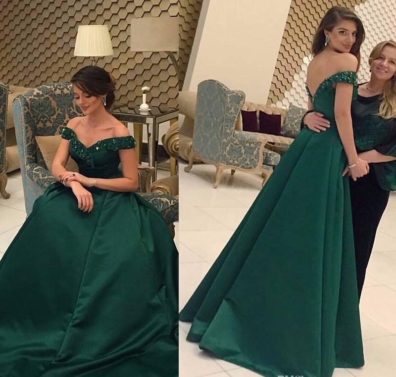 Formal Long Hunter Green Prom Dresses Beaded off the Shoulder Satin A Line Evening Celebrity Gowns