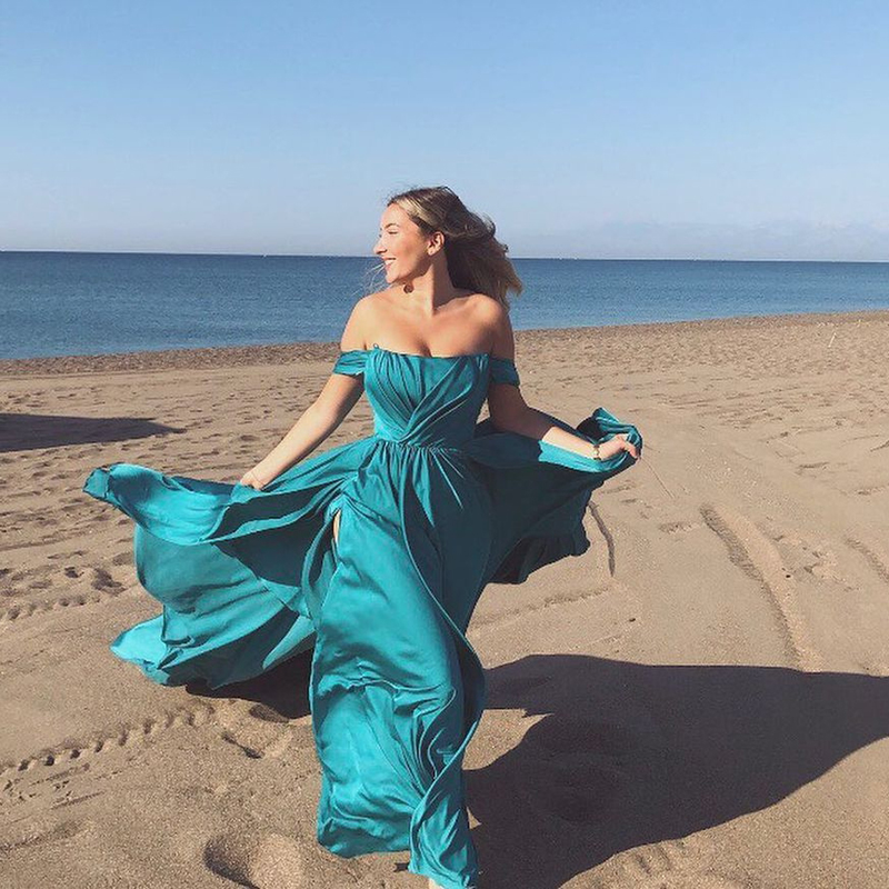 Elegant Turquoise Off The Shoulder A-Line Silk Satin Prom Dress Sexy High Split Long Evening Dress