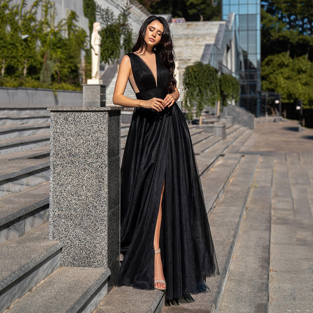Sexy A-Line Gliiter Evening Dress Sleeveless V-Neck Tulle Evening Gown Backless Prom Dress
