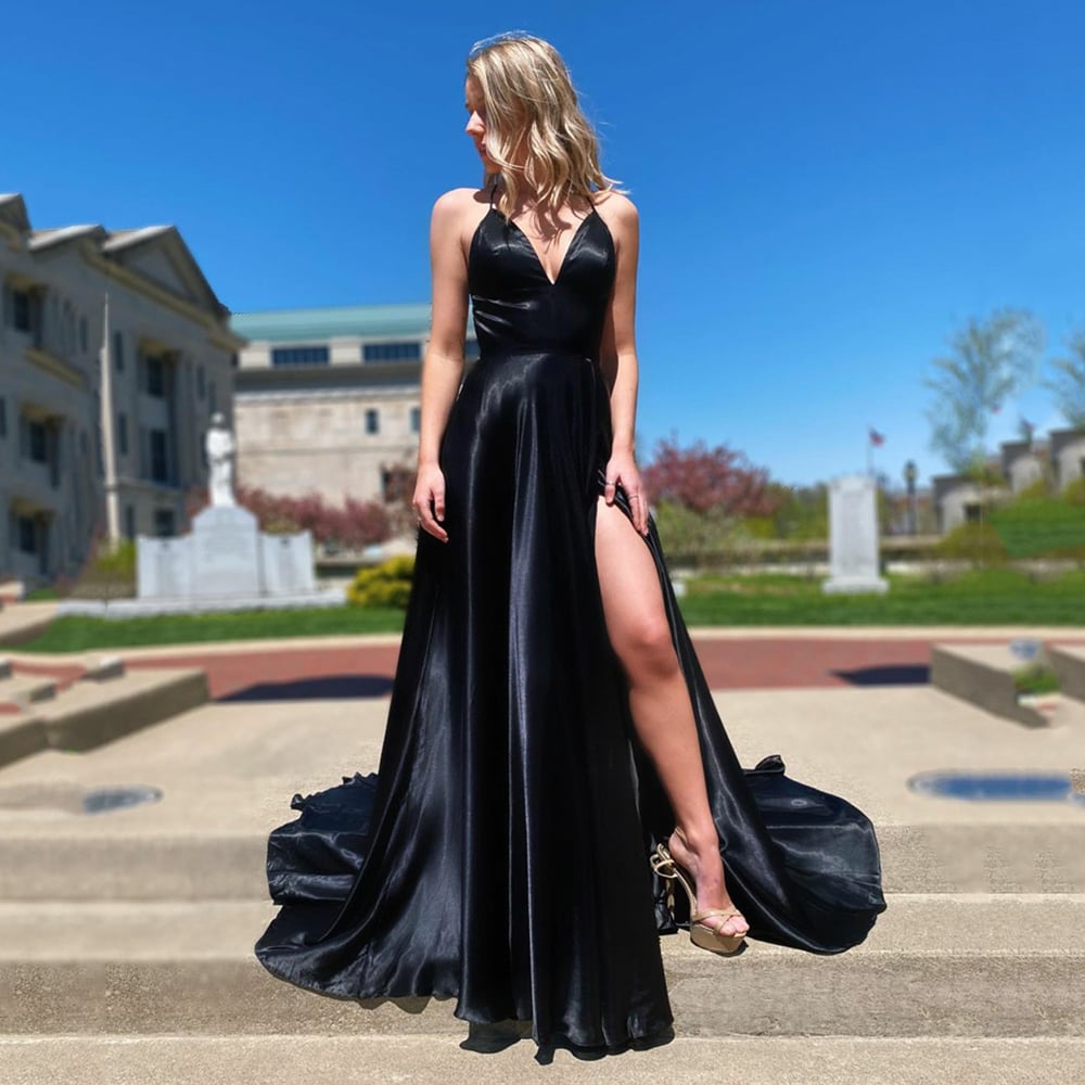 Sexy Black High Slit Backless Floor Length Prom Dress A-Line V-Neck Spaghetti Straps Evening Gowns
