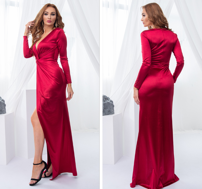 Burgundy Knot Ruched Long Sleeve Evening Gown Stretchy Satin High Slit Formal Party Dress