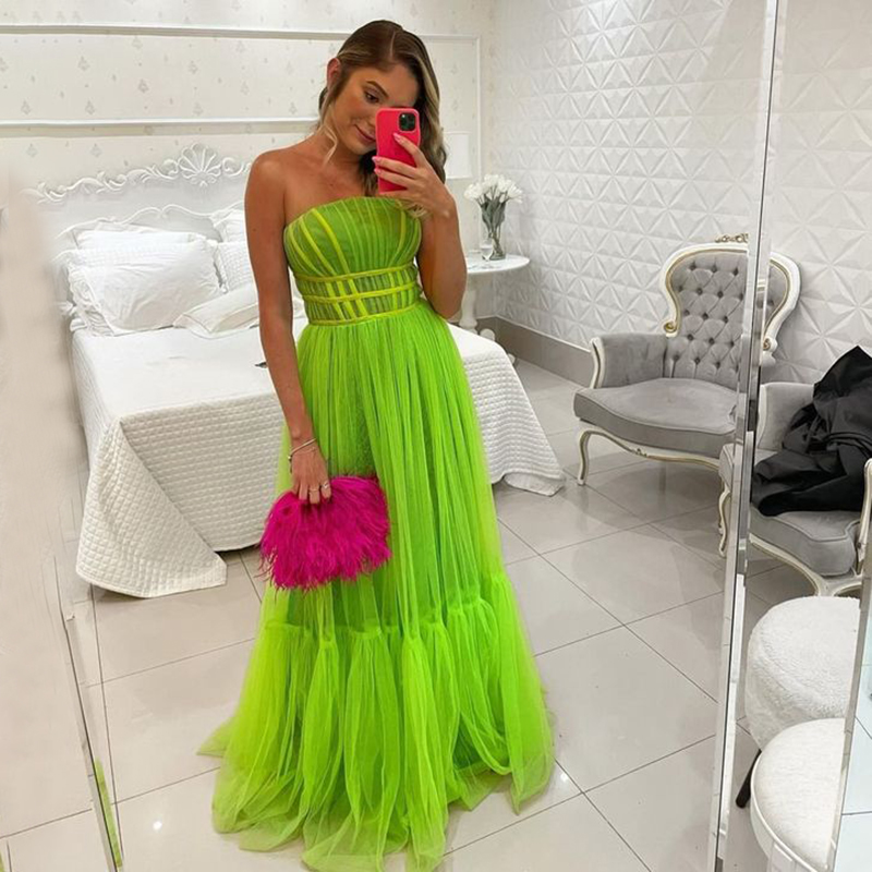 Lime Green Tulle Strapless Evening Dress Custom Made Plus Size Floor Length Pleated A Line African Prom Gowns