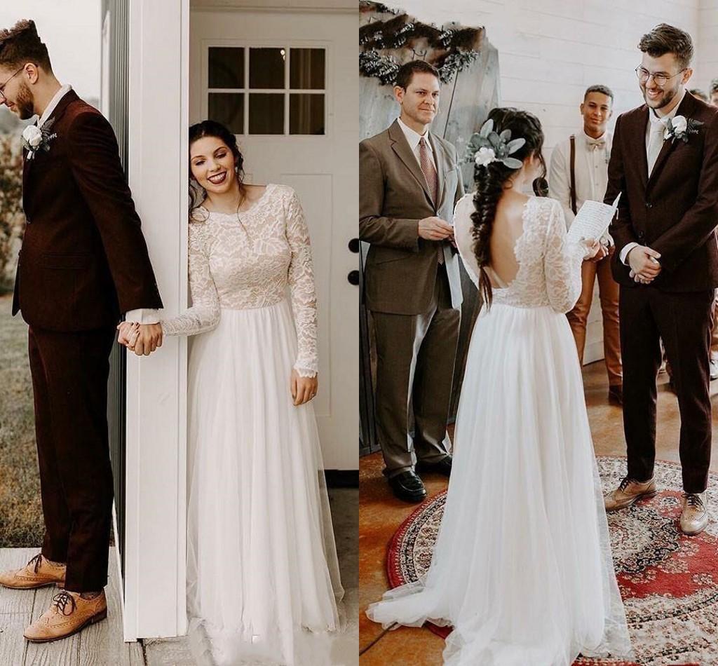 Bohemian Wedding Dresses Bateau Backless Long Sleeve Sweep Train A Line Lace Illusion Beach Country Boho Bridal Gowns
