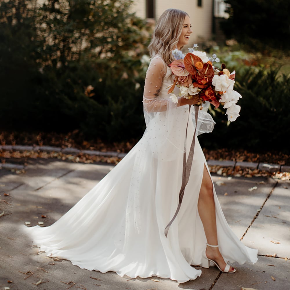 High Split Chiffon Pearls Bolero Wedding Gowns A Line Spaghetti Straps Slip Long Flare Sleeve Bridal Dress