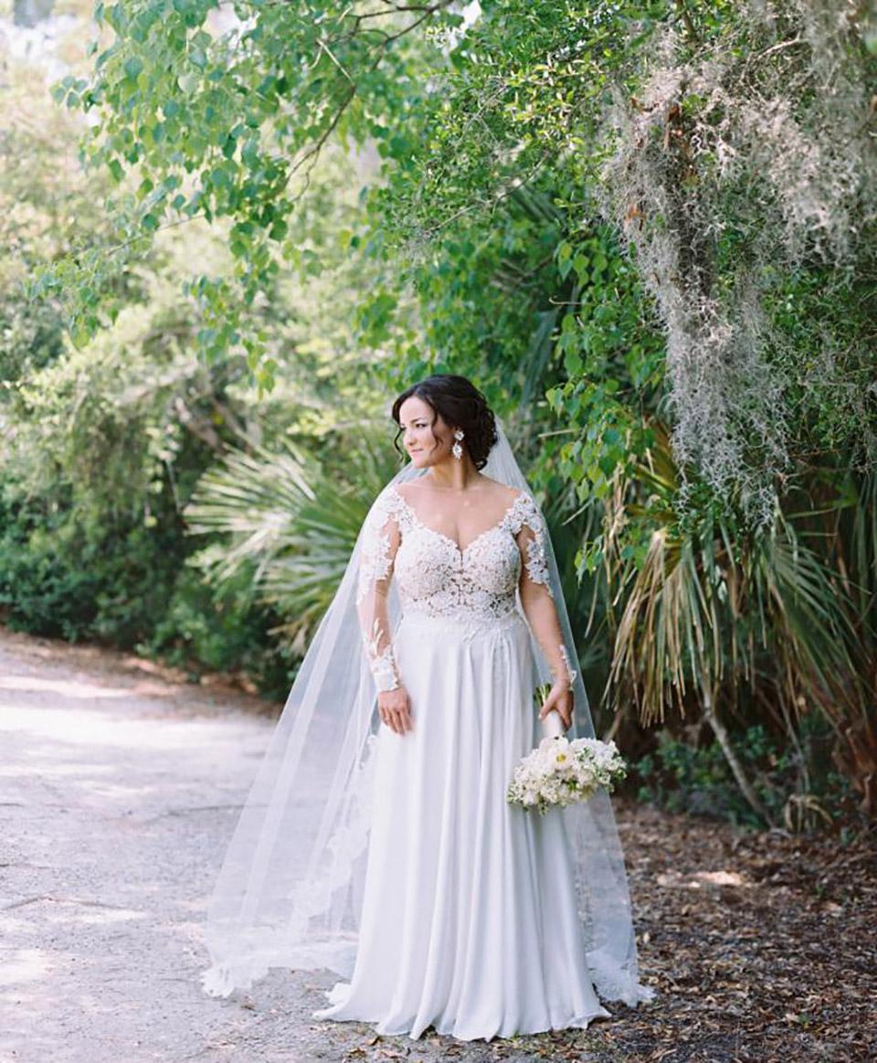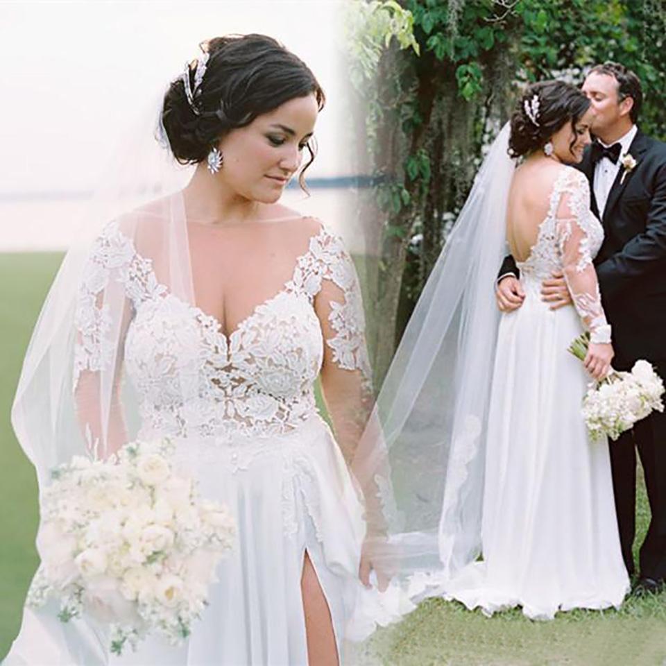 Modest Plus Size Bohemian Wedding Dresses Long Sleeves Sheer Neckline A Line Beach Bridal Gowns Chiffon Side Split Wedding Dress