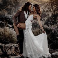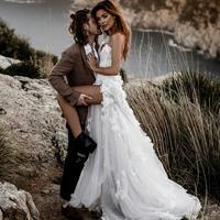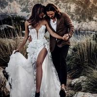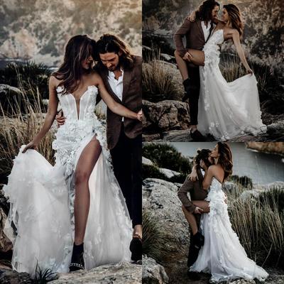Sexy Bohemian Wedding Dresses Slit Sweetheart Lace 3D Floral Appliques A Line Beach Wedding Dress