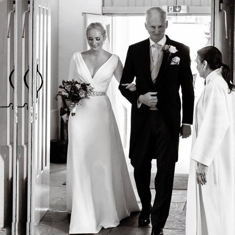Deep V Neck Wedding Dresses with Beaded Sash Long Sleeevs Bridal Gowns