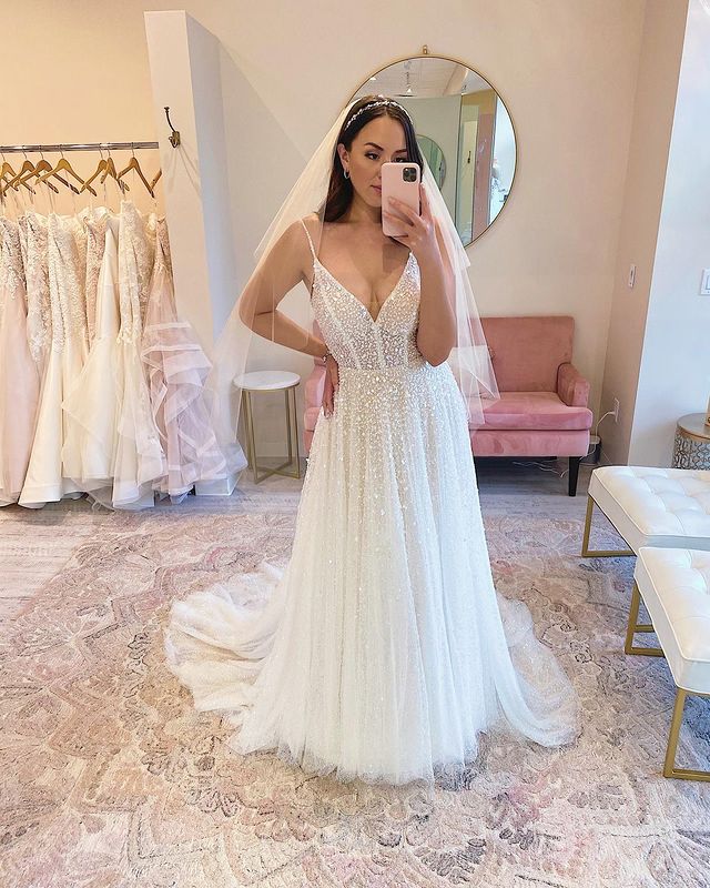 Sparkly Glitter A Line V Neck Straps Sequin White Wedding Dresses