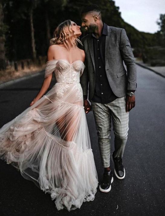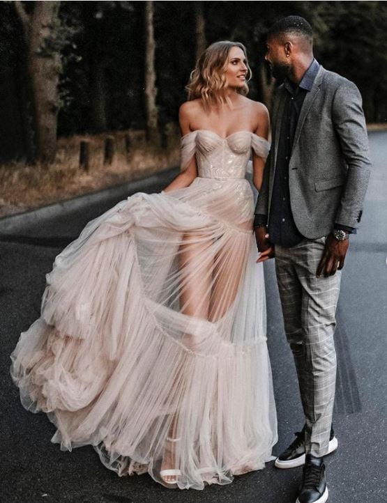 Bohemian wedding dress, shoulder off sleeveless tulle lace wedding dress
