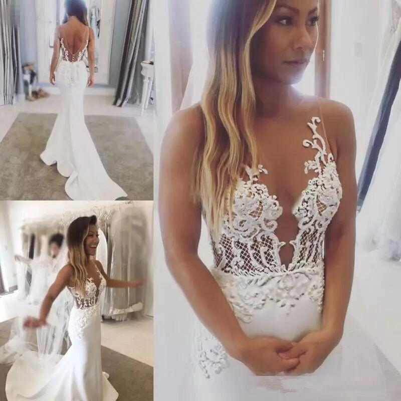 Hot Sexy Mermaid Lace Wedding Dresses Sweep Train Illusion Backless Garden Beach Bohemian Wedding Dresses Bridal Gowns