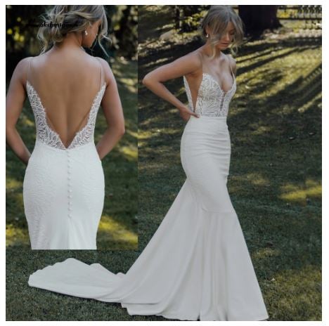 Sexy Plunging V Neck Sleeveless Lace Stretch Crepe Wedding Dress Open Back Bridal Gowns