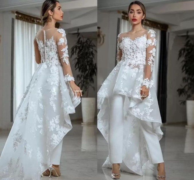Sexy Illusion Long Sleeve Wedding Dress Jumpsuit with Train Sheer Neck Lace Floral Country Bohemian Beach Lesbian Bridal Gowns