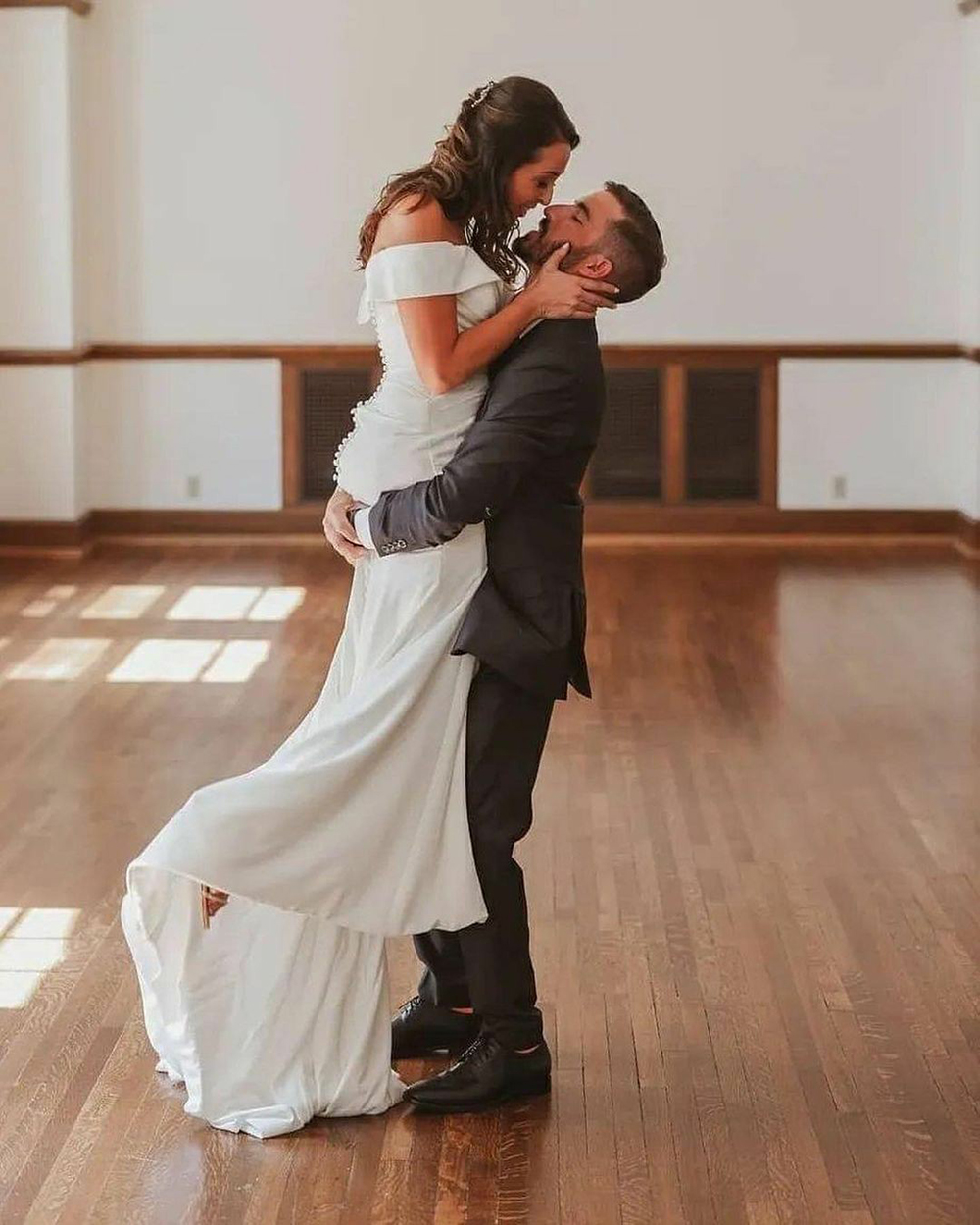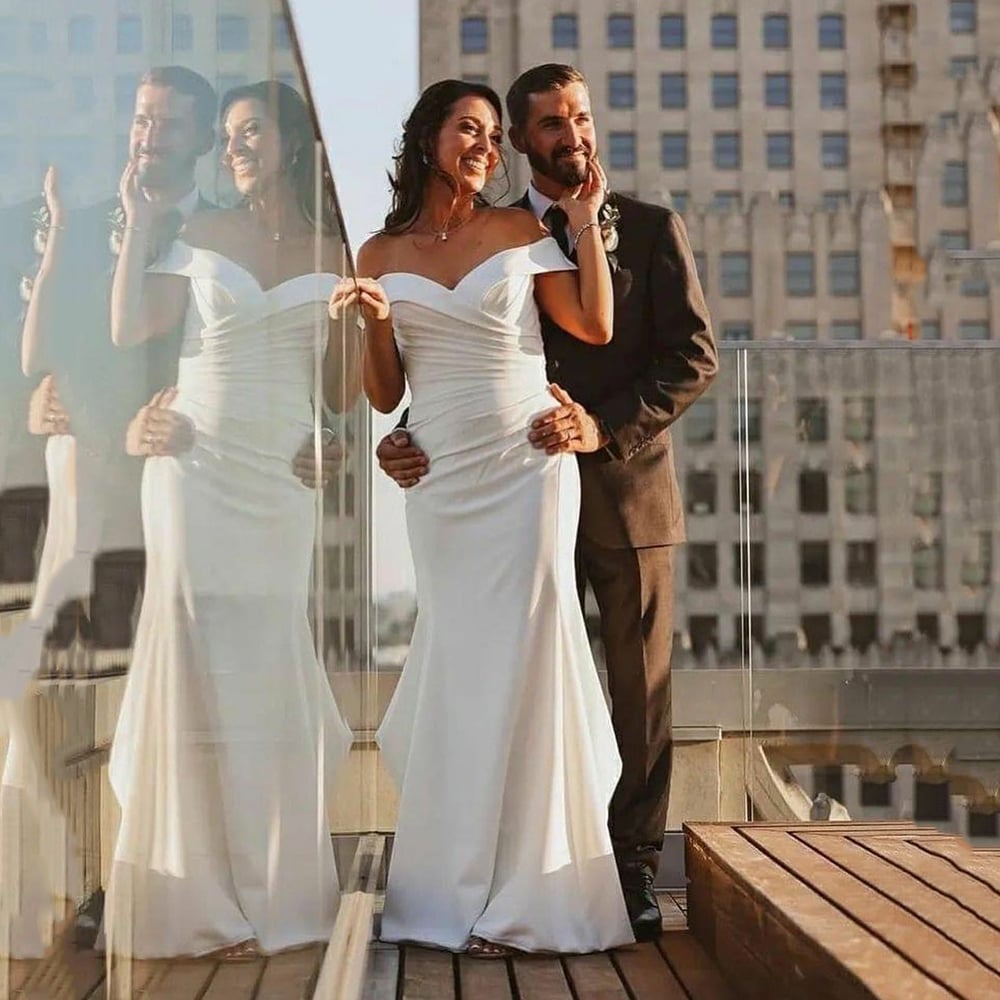 Off The Shoulder Open Back With Button Pleat Sweep Train Satin Bridal Gown