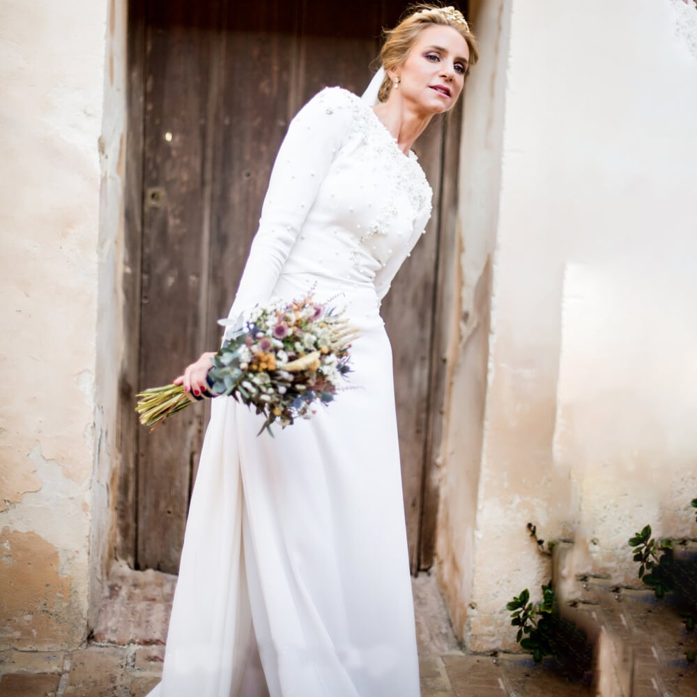 Muslim Thick Satin Long Fitted Sleeves Wedding Dress Custom Made Ivory Pearls Covered Back Sheath Scoop Neck Vintage Bridal Gown