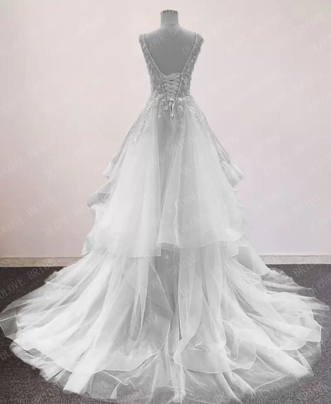 Illusion V-neck Cascading Ruffles Wedding Dress Beaded Backless Bridal Gowns