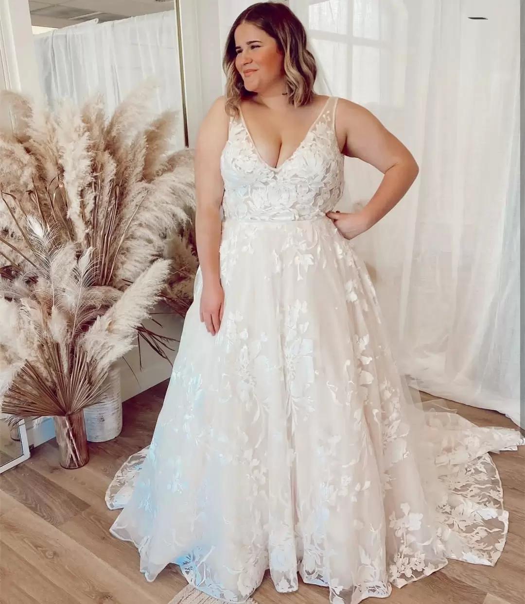 Boho Lace Applique Bodice Tulle Sweep Train V Neck Tulle Sleeveless Custom Made Wedding Dresses Bridal Gown