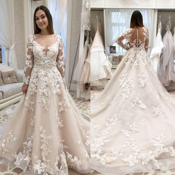 Boho Wedding Dresses with 3D Floral Applique Custom Made Long Sleeves Chapel Train Garden Covered Buttons Wedding Gown