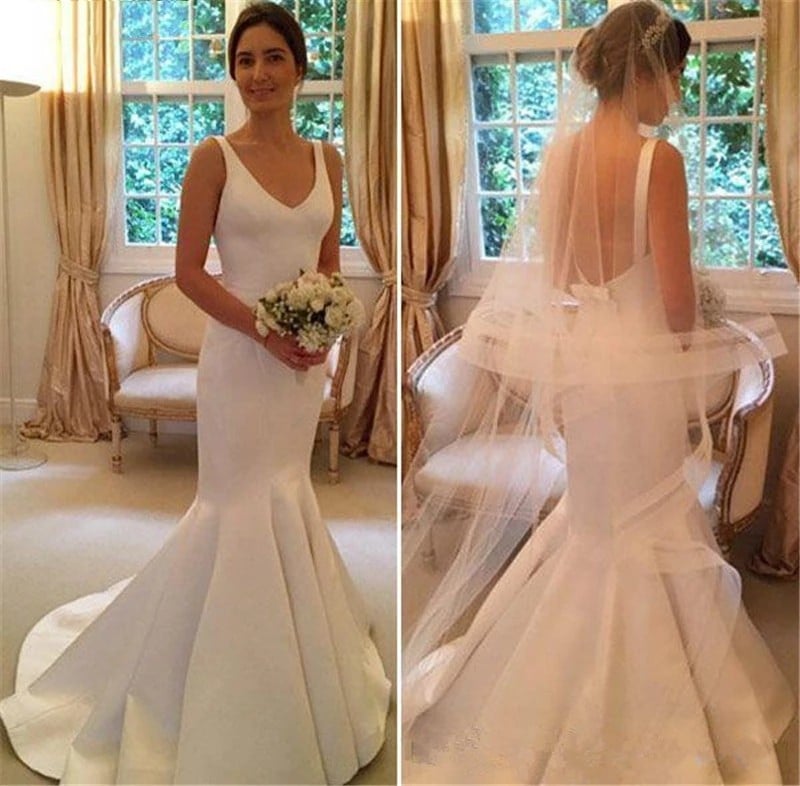 Sexy V-Neck Court Train Simple Design Backless Satin Wedding Dresses