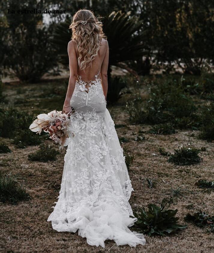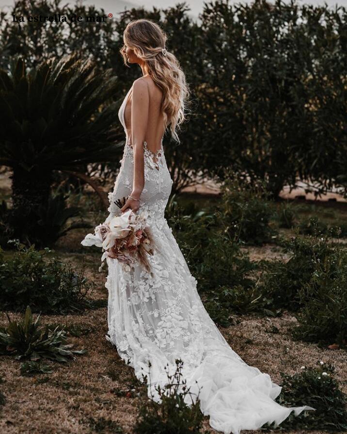 Bohemian 3D Flowers Countryside Mermaid Wedding Dresses Sexy Deep V Neck Backless Bridal Gown