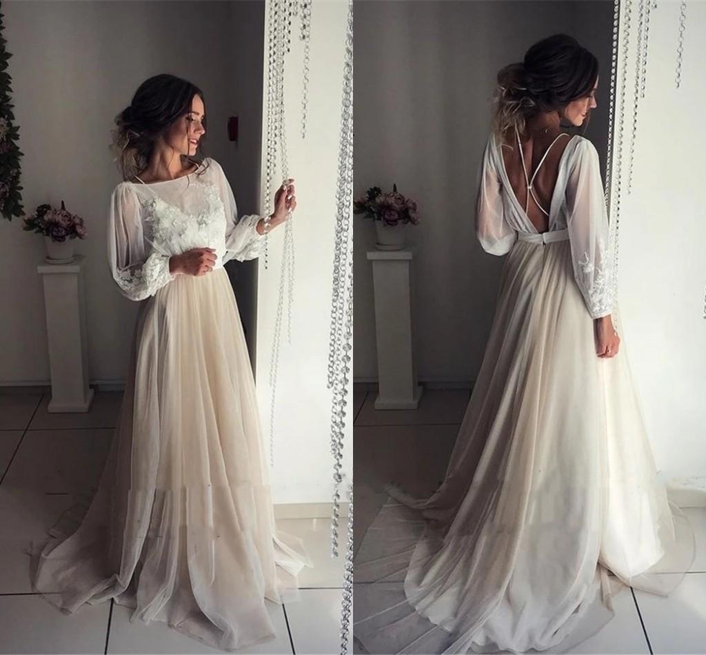 Boho Vintage Tulle A Line Wedding Dress Ivory Lace Applique Puffy Long Sleeves Sheer Scoop Neck Champagne Skirt Garden Country Bridal Gowns