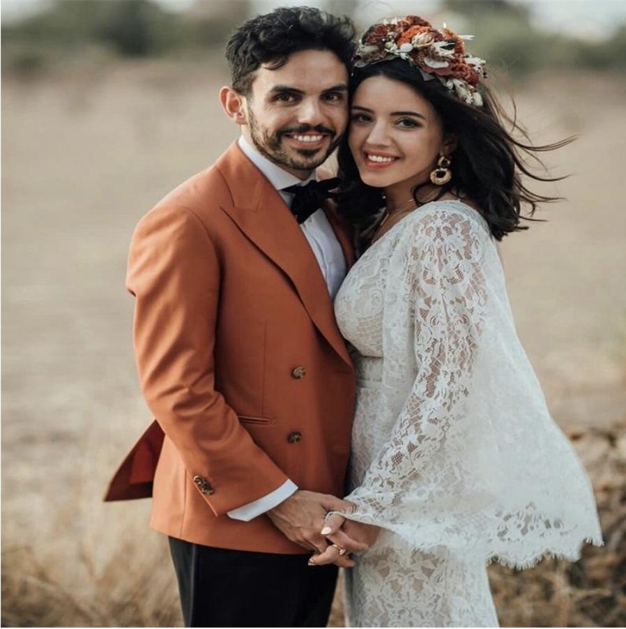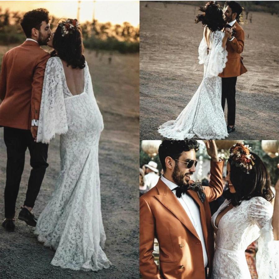 Boho Wedding Dress Mermaid Lace Long Flare Sleeve Open Backless Deep V Neck Hippie Bridal Gowns