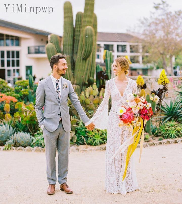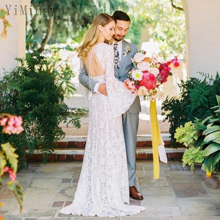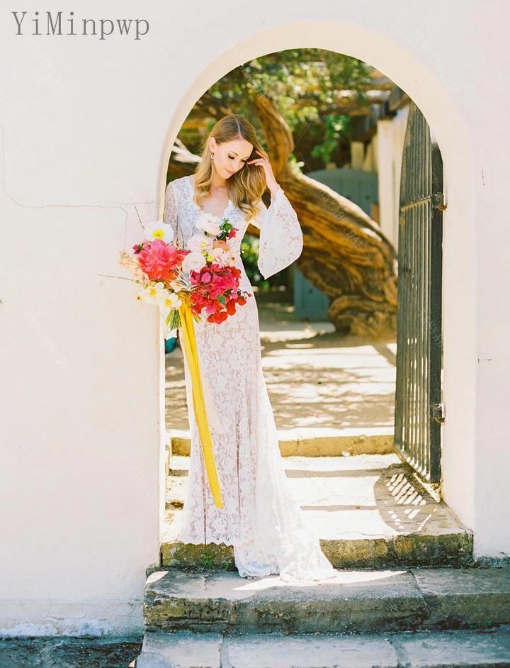 Lace Wedding Dresses V Neck Backless Long Sleeve Sweep Train Beach Garden Country Boho Bridal Gowns
