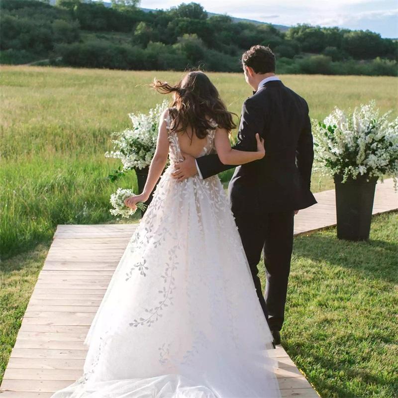Sexy V-neck Beach A-line Wedding Dresses Sleeveless Custom Made Sweep Train Bridal Gown Hot Sale Appliqued Lace Bohemian Boho Bridal Gown