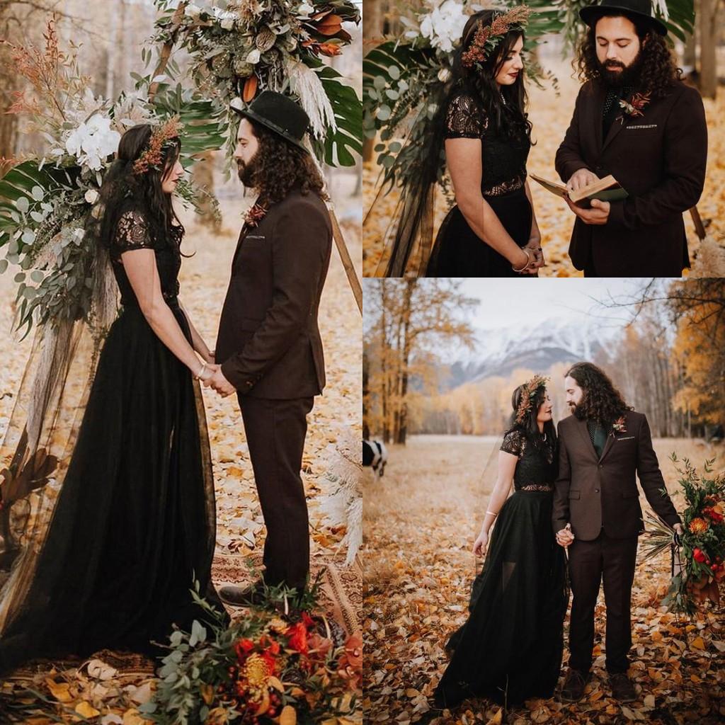 Vintage Black Gothic Country Wedding Dresses with Short Sleeve Jewel Neck Cutside Bohemian Beach Outdoor Bride Wedding Gown
