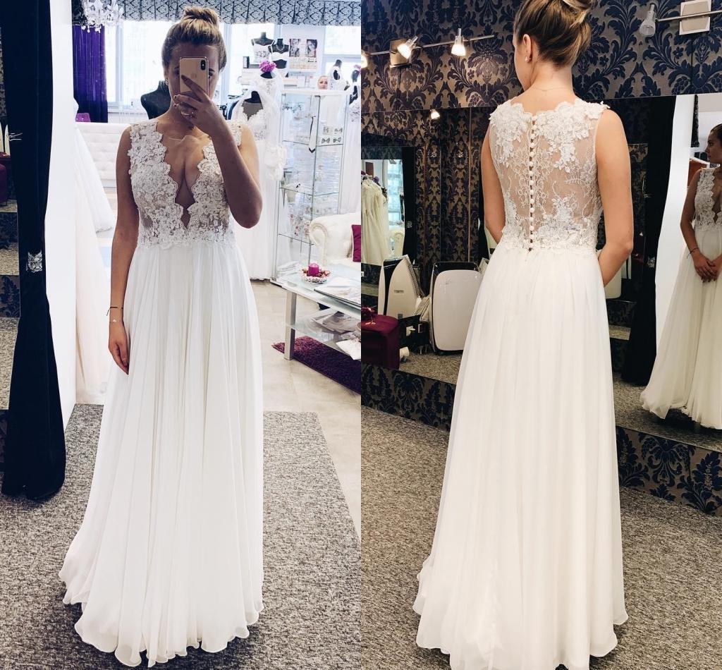 Bohemian Wedding Dresses Sheer Neck Floor Length A Line Illusion Bodice Lace Appliques Country Beach Bridal Gowns