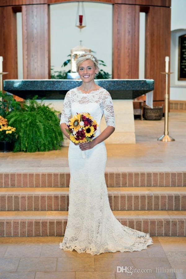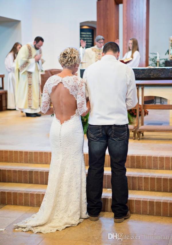 Lace Beach Mermaid Wedding Dresses Hollow Back Jewel Illusion Sweep Train Bohemian Bridal Gowns