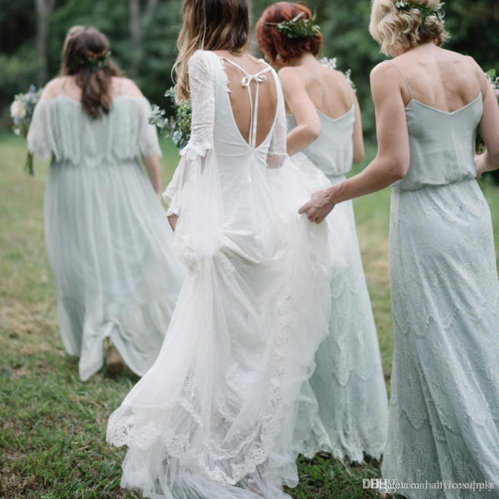 Lace Deep V Neck Beach Boho Wedding Dresses Long Sleeves with Ribbon Open Back vestidos de novia Bohemian Bridal Gown