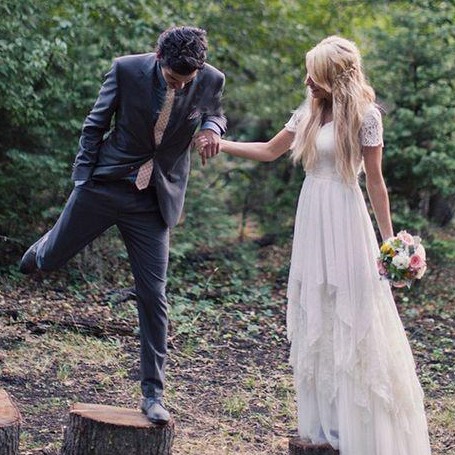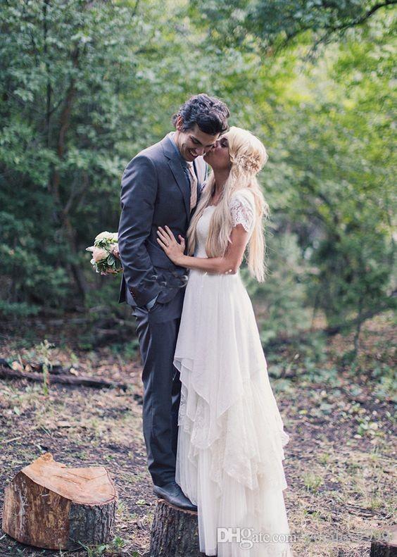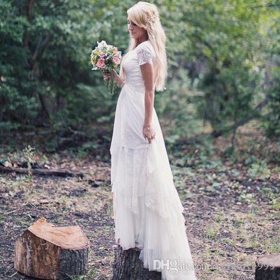 Western Country Wedding Dresses A-Line with Short Sleeve Jewel Lace Floor Length Chiffon Vintage Boho Garden Beach Wedding Bridal Gowns