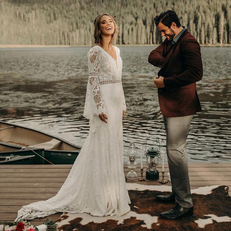 Bohemian Mermaid Wedding Dress Sexy Backless Bride Dresses Cotton Crochet Lace Long Sleeve Country Boho Beach Bridal Gowns