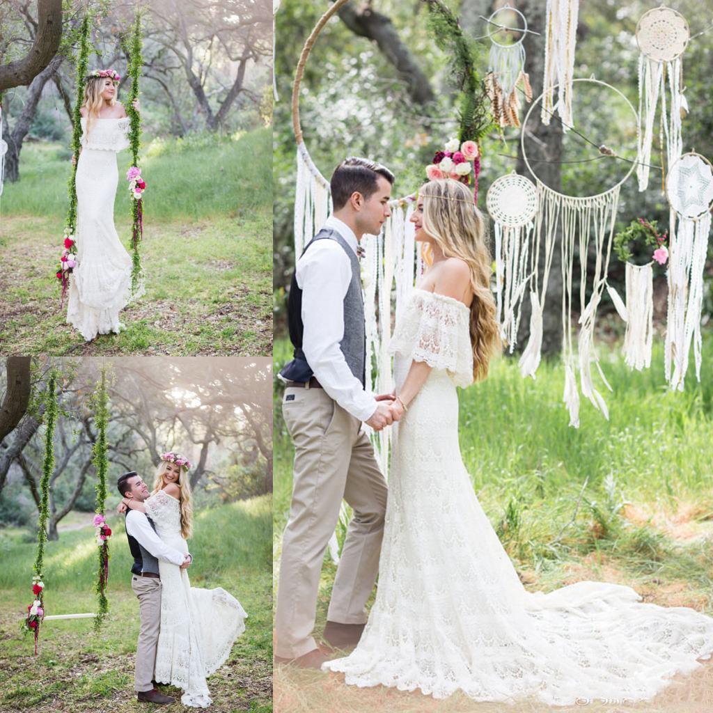 Bohemian Wedding Dresses Off the Shoulder Short Sleeve Boho Lace Long Mermaid Bridal Gowns