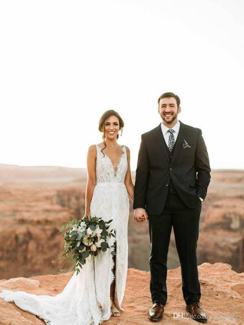Sexy Split Front Boho Wedding Dresses Exclusive Lace Sleeveless Deep V Neck Mermaid Wedding Dress Beach Country Bohemian Bridal Gowns