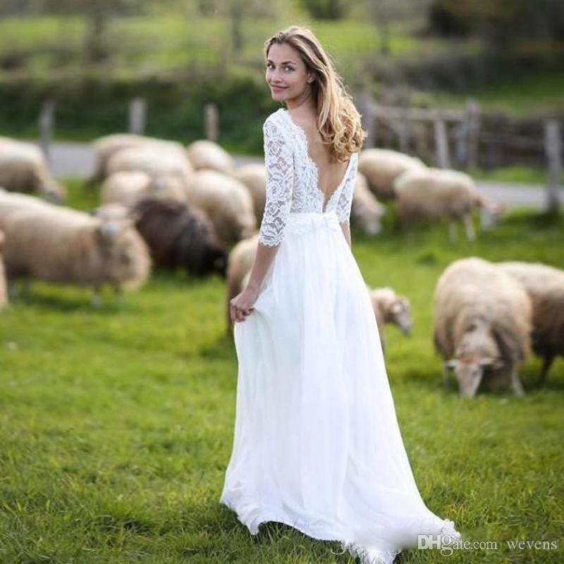 Simple Bohemian A Line Beach Wedding Dresses Scoop Neck With 3/4 Sleeve Backless Boho Bridal Gowns Chiffon Country Wedding Gown