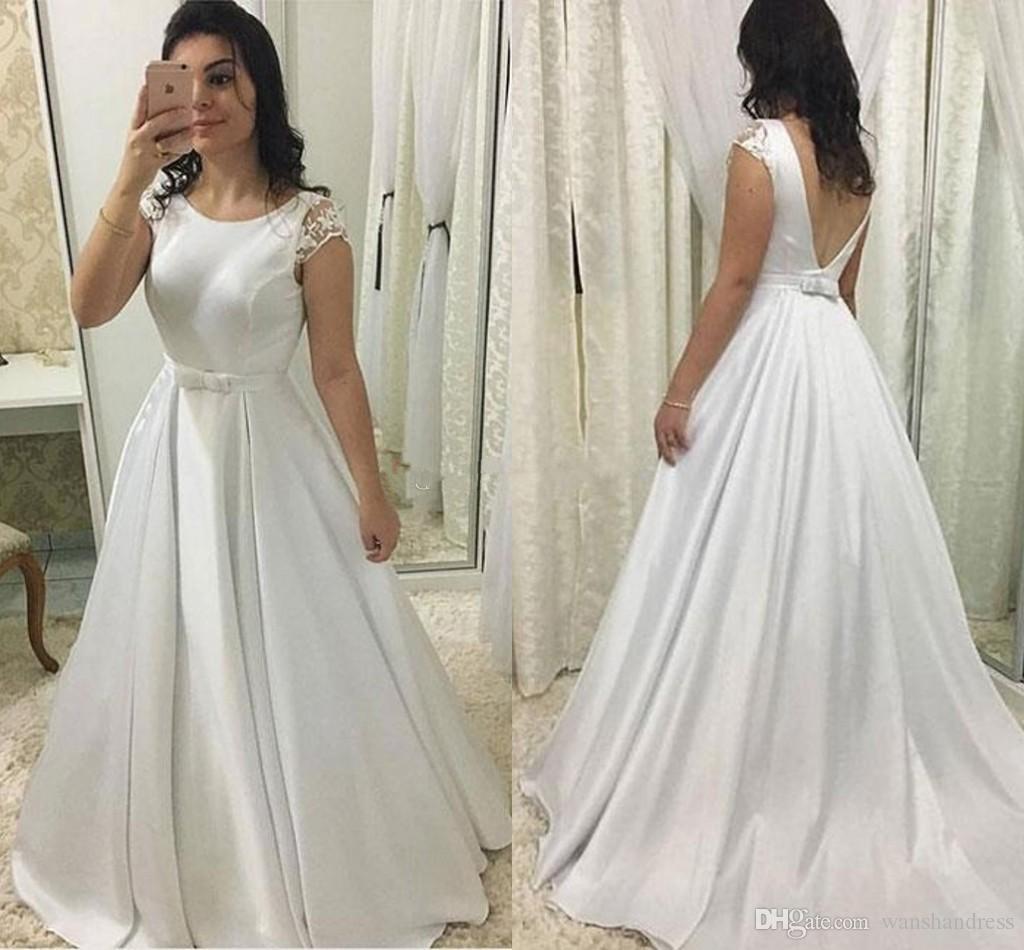 Simple Satin A-Line Wedding Dresses Cap Sleeves Backless Bridal Dress Long Satin Wedding Gowns