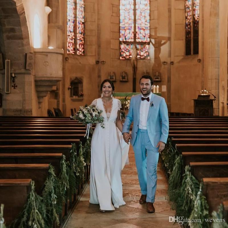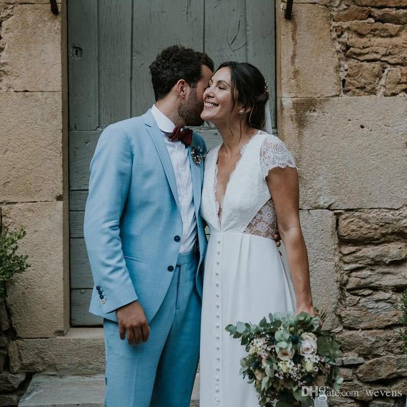 Simple Bohemian A Line Wedding Dresses Short Sleeve Deep V Neck Lace Front Split Satin Garden Bridal Gowns Country Wedding Dress