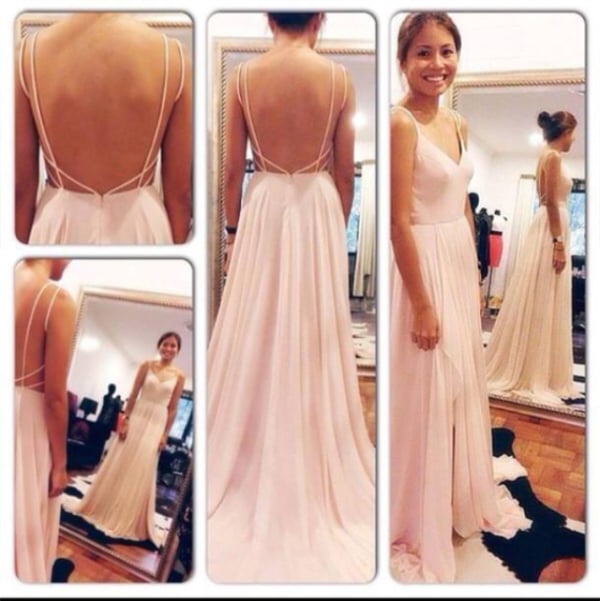 Custom Simple Backless Prom Dress V-neck Blush Pink Long Slit Prom Dresses