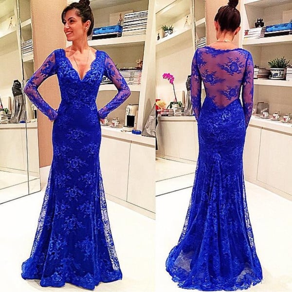 Royal Blue Lace Mermaid Prom Dresses Long Sleeves See Through Prom Gowns V Neck Evening Dresses