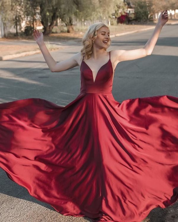 Elegant A-Line V Neck Burgundy Silk Satin Long Prom Dress