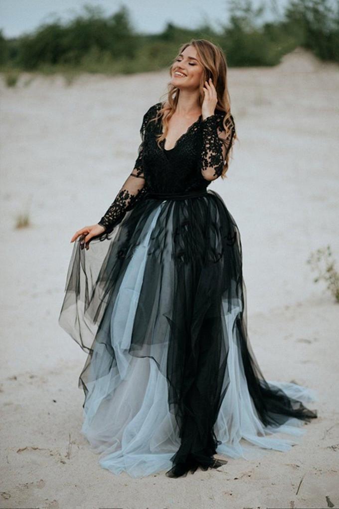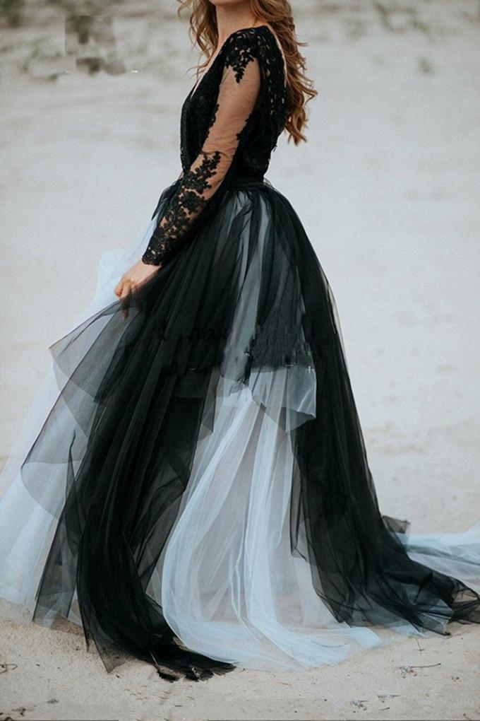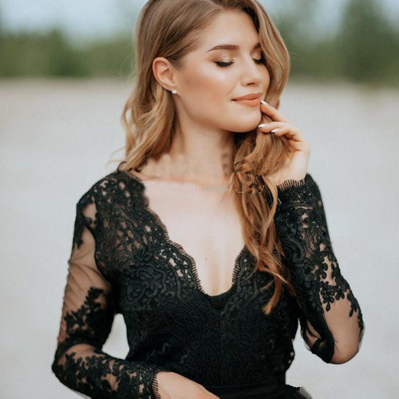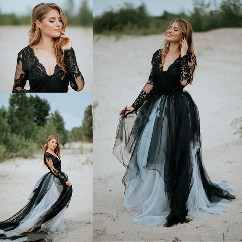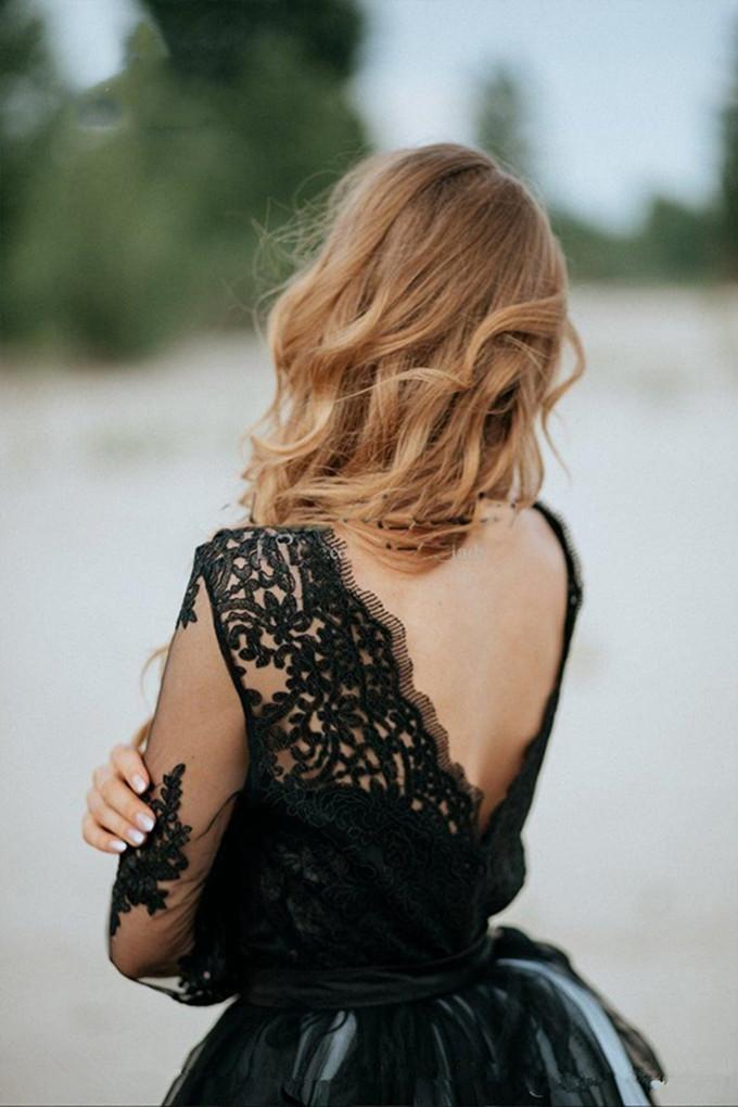 Summer Beach Gothic Wedding Dresses Black Lace Long Sleeves Country V Neck Black Bridal Gowns
