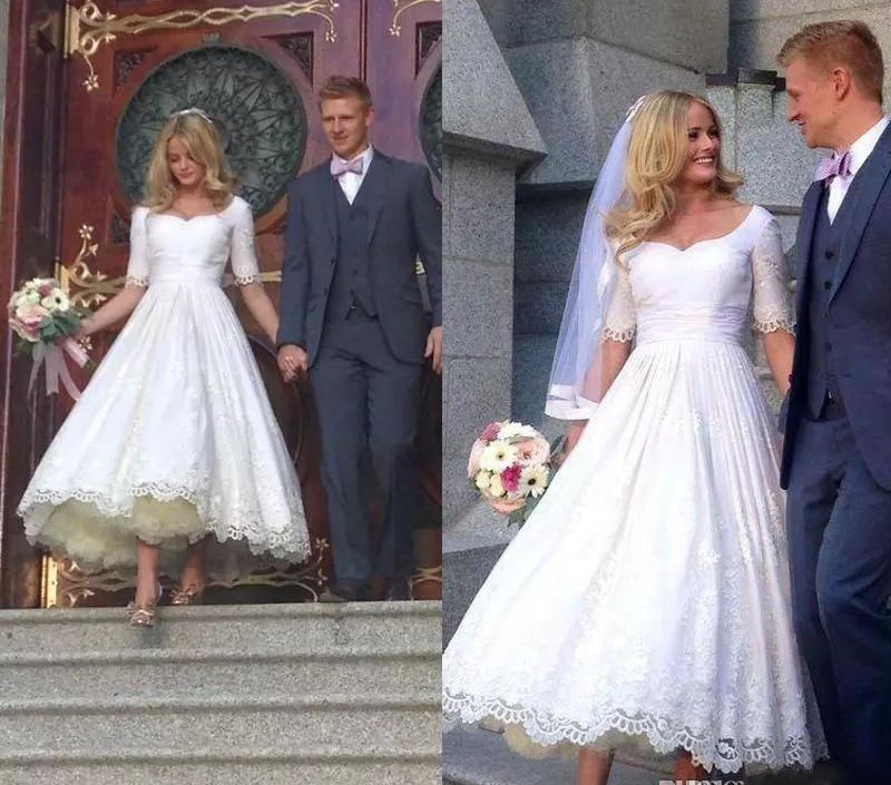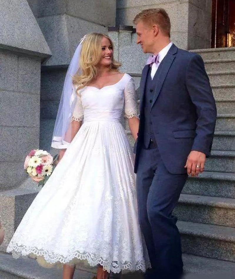 Vintage Half Sleeve Short Wedding Dresses A Line V-Neck Lace Appliques Tea-Length Bridal Gowns Boho Plus Size Country Wedding Dress
