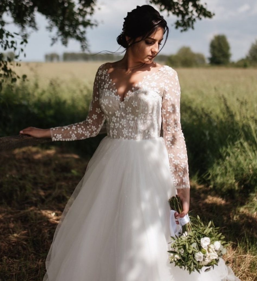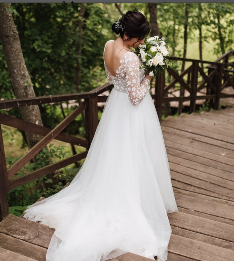 Elegant Boho Wedding Dress Sexy A-line V-Neck Appliques Full Sleeves Tea Length Button Bridal Gown