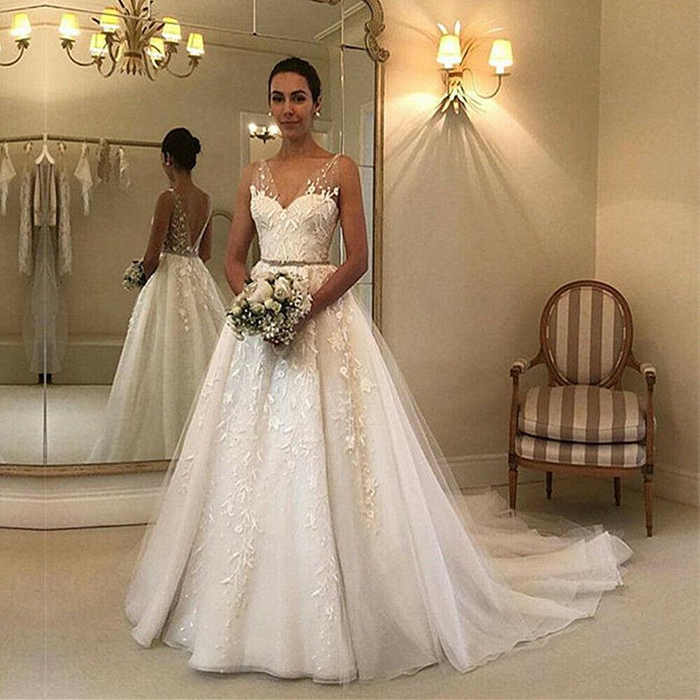 Gorgeous V-Neck Sleeveless Wedding Dresses Tulle Lace Appliques Bridal Gowns