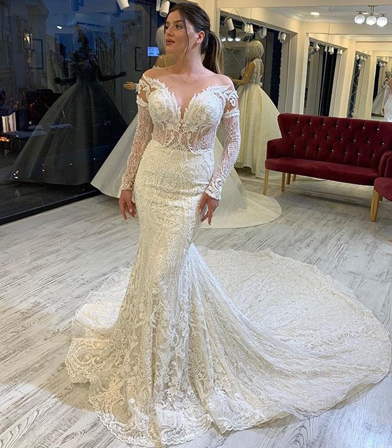 Jewel Neck Long Sleeves Lace Mermaid Wedding Dresses Appliqued Sweep Train Backless Plus Size Bridal Gowns