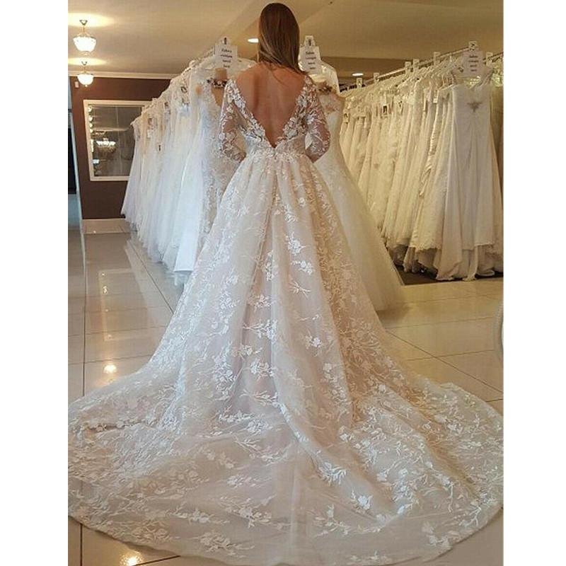 Long Sleeve A Line Lace Wedding Dresses Tulle Appliques Backless Sweep Train