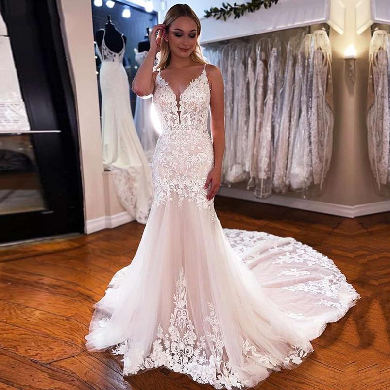 Spaghetti Neck Boho Lace Mermaid Wedding Dresses with Appliques Court Train Tulle Beach Plus Size Bridal Gowns