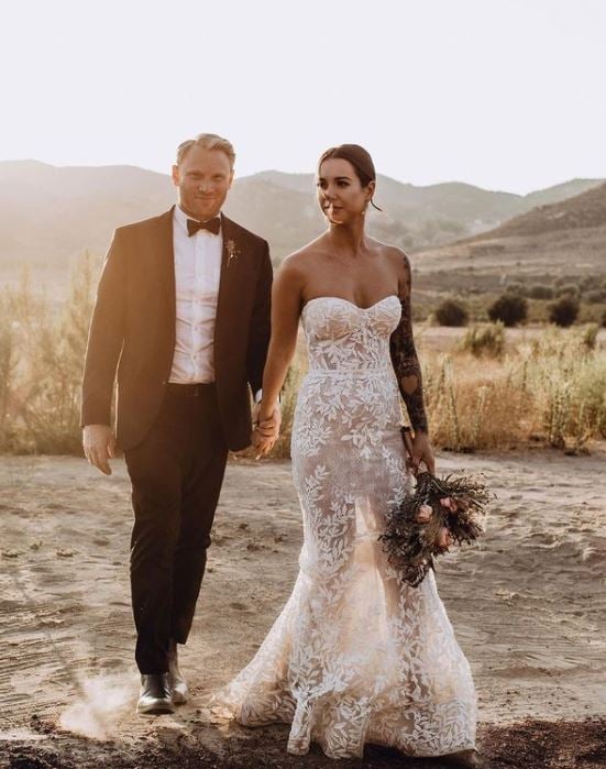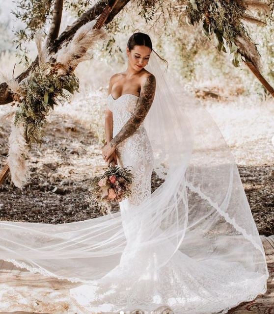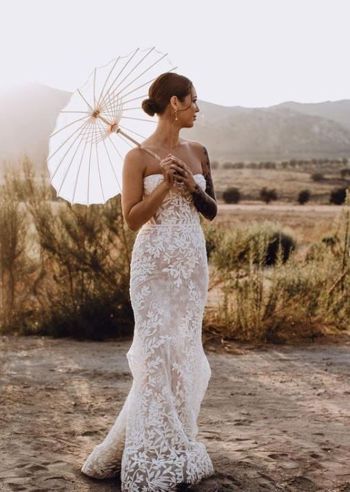 Bohemian wedding dress, simple sleeveless V-neck lace applique strapless wedding dress