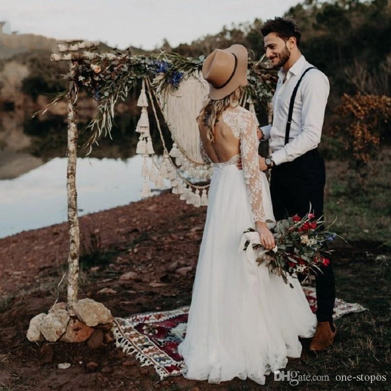 Sexy Open Back Long Sleeves Lace A-line Wedding Dresses Cheap Layers Tulle Beach Bohemian Bridal Gown